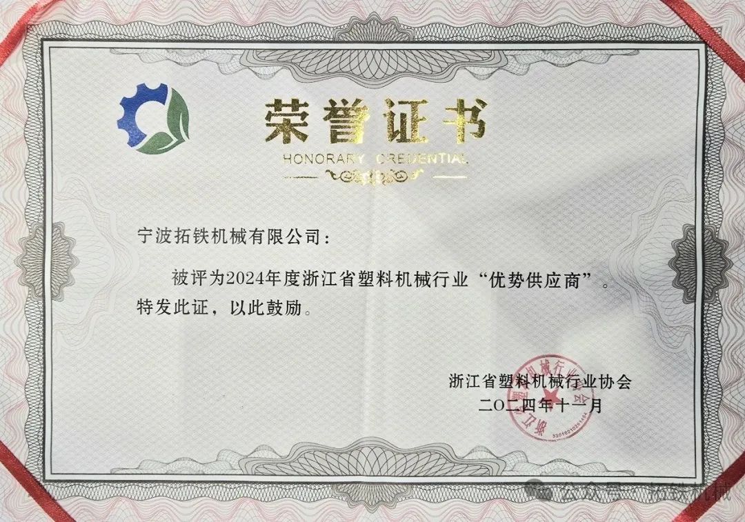 喜报!拓铁再获浙江省塑机协会“优势供应商”荣誉